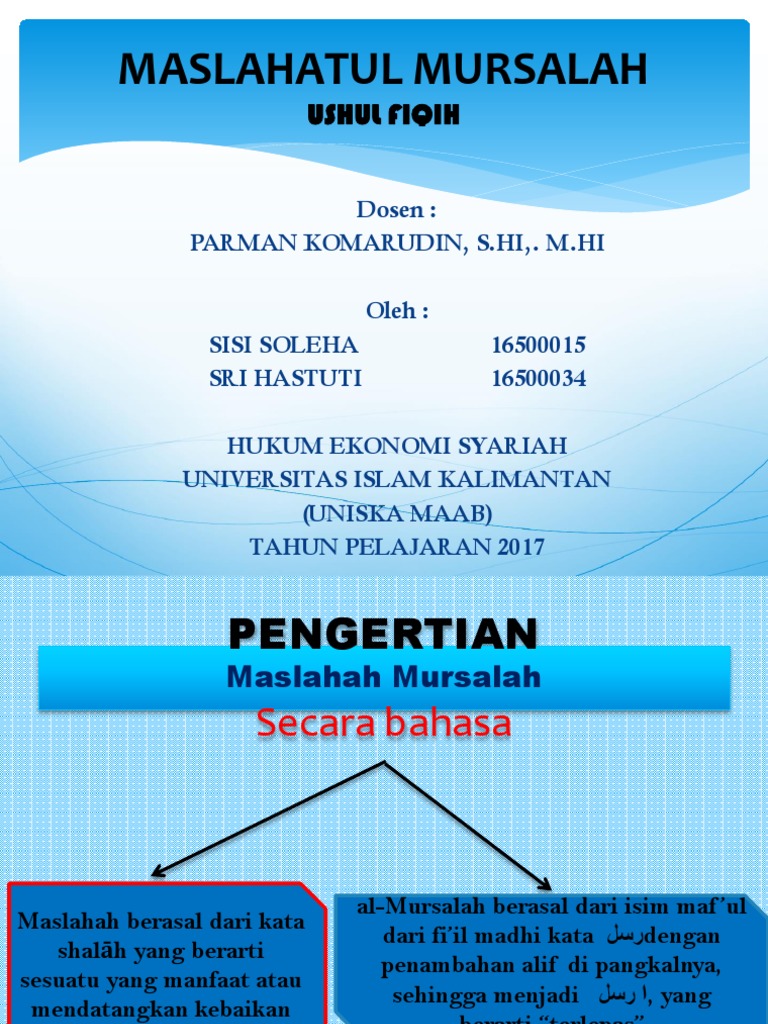 Mas lah ah al mursalah mas lah ah al mursalah yaitu al mas lah ah yang tidak diakui syara dan tidak pula ditolak dan dianggap batiloleh syara akan tetapi masih sejalan secara substantif dengan kaidahkaidah hukum yang universal. Istilah al masalih al mursalah didefinisikan oleh para ulama sebagai kepentingan yang tiada keterangan nas secara langsung sama ada memperakuinya atau menolaknya. Ada 2 maslahah mursalah definition kata orang bule atau definisi perihal pengertian maslahah mursalah yakni pengertian berdasarkan asal kata atau bahasa dan menurut istilah. Perkataan al masalih adalah jamak yang diambil dari perkataan al maslahah yang berasal daripada perkataan arab iaitu kebaikan h.