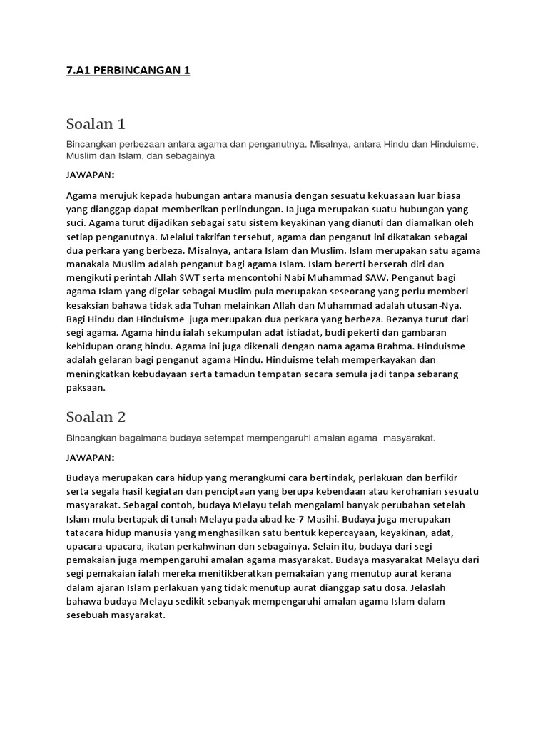 Hubungan antara kebudayaan agama dan adat istiadat dalam pelaksanaannya di kehidupan manusia dapat dijelaskan dengan sederhana yaitu manusia sebagai makhluk sosial dalam kehidupannyayang dapat dipengaruhi oleh unsur unsurkebudayaan agama dan adat istiadat di daerah atau lingkungan tempat dia tinggal seperti saat dia berbicara atau melakukan suatu kegiatan misalnya makan minum dan juga. Agama itu timbul sebagai jawaban manusia atas penampakan realitas tertinggi secara misterius yang menakutkan tapi sekaligus mempesonakan dalam pertemuan itu manusia tidak berdiam diri ia harus atau terdesak secara batiniah untuk merespons dalam kaitan ini ada juga yang mengartikan religare dalam arti melihat kembali kebelakang kepada hal hal yang berkaitan dengan perbuatan tuhan yang harus. Soalan 2 bincangkan bagaimana budaya setempat mempengaruhi amalan agama masyarakat. Malaysia merupakan sebuah negara yang unik kerana terdiri daripada masyarakat berbilang kaum.