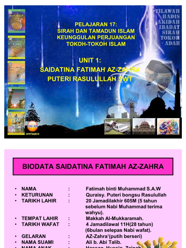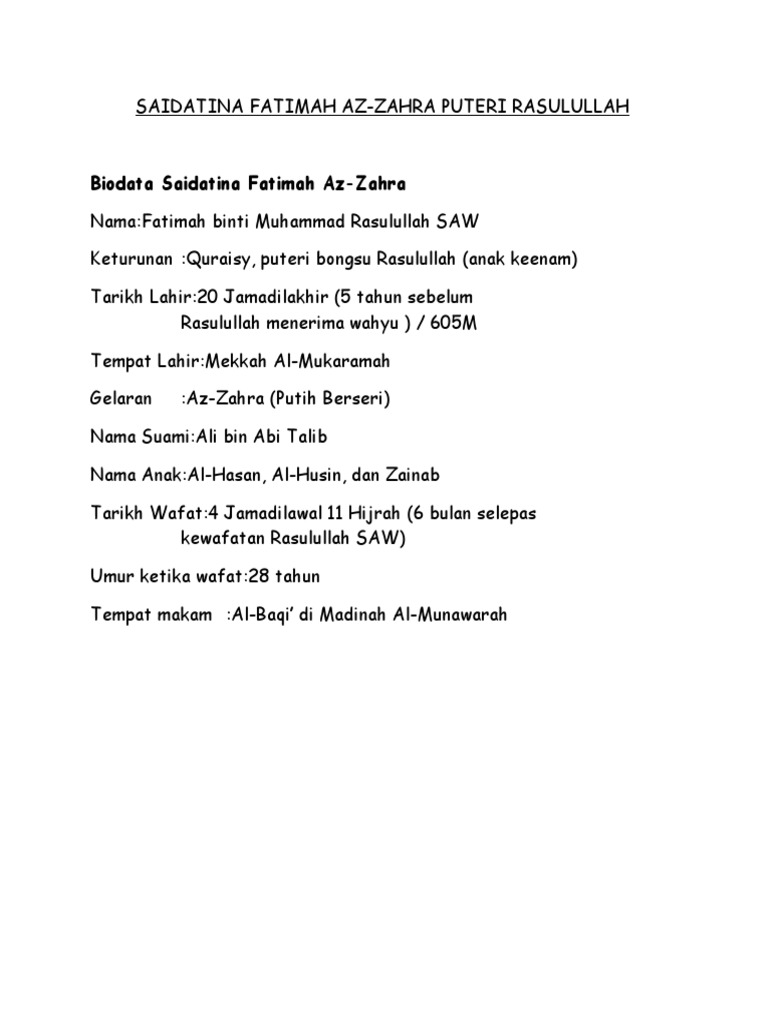 Biodata saidatina fatimah az zahra nama. Saidatina fatimah az zahra puteri rasulullah saw. Kelahiran saidatina fatimah dan peranannya dalam hidup rasulullah ini ibarat bunga yang mekar dengan begitu indahnya. Lahir pada hari jumat 20 jumadil akhir sekitar tahun 614 m menurut syi ah atau tahun 606 m menurut sunni tahun kelima kerasulan nabi muhammad di mekah.