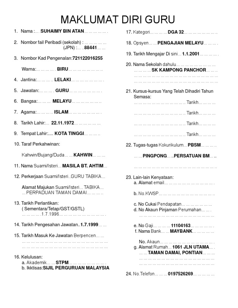 Disini saya ingin share contoh borang maklumat buku guru fail rph. Untuk tujuan elektronik gl dan faedah pencen. Hubungan suami isteri anak ibu dan bapa kandung. Rancangan pengajaran harian matapelajaran.