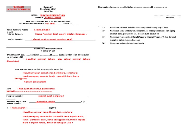 Bagi daerah di mana tiada unit pusaka kecil urusan penerimaan permohonan borang a dan borang p boleh dibuat melalui pejabat tanah di daerah daerah berkenaan. Borang p subperaturan 12 1 malaysia negeri daerah. Bagi daerah di mana tiada unit pusaka kecil urusan penerimaan permohonan borang a dan borang p boleh dibuat melalui pejabat tanah di daerah daerah berkenaan. Urusan permohonan pusaka kecil urusan permohonan pengambilan tanah dan urusan penguatkuasaan dan hasil persekutuan.