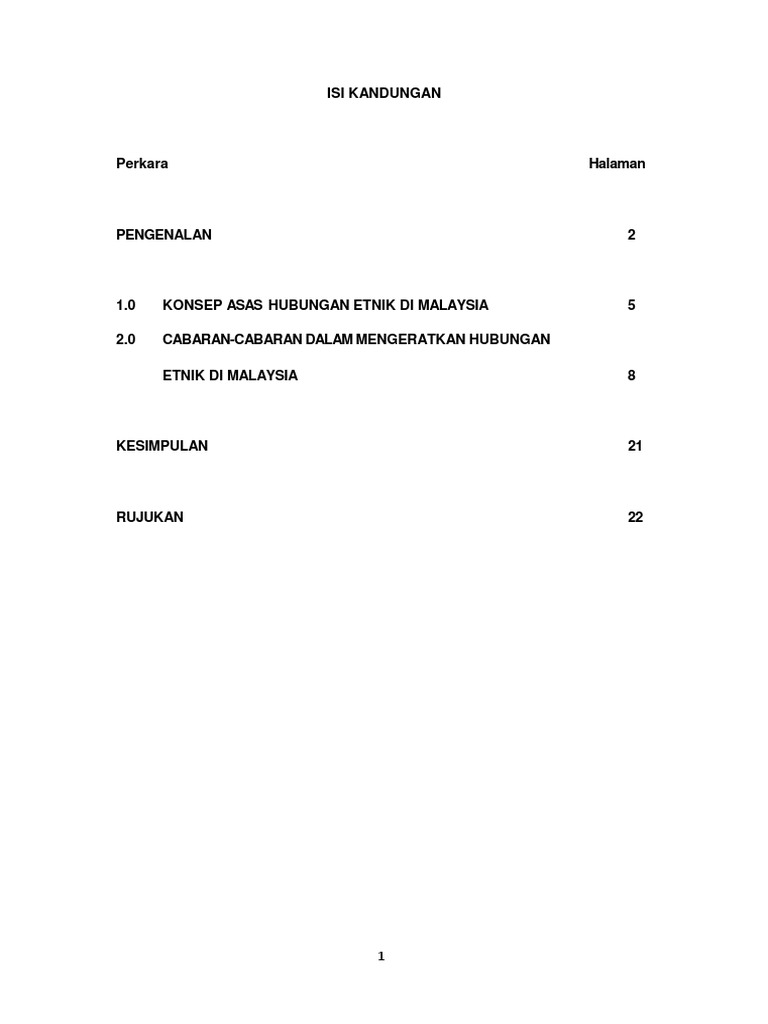 Hubungan etnik di malaysia. Dasar pendidikan negara perlulah dirancang dan dilaksanakan dengan matlamat untuk melahirkan individu yang berilmu dan berkemahiran yang akhirnya mampu untuk bersaing dalam pelbagai bidang pada masa akan datang terutamanya bidang ekonomi. Dalam kepelbagaian itu persefahaman juga menjadi asas yang kukuh untuk mengekalkan keharmonian keamanan dan ketenteraman di negara ini. Isi kandungan perkara halaman pengenalan 2 1 0 konsep asas hubungan etnik di malaysia 5 2 0 cabaran cabaran dalam mengeratkan hubungan etnik di malaysia 8 kesimpulan 21 rujukan 22 1 2.