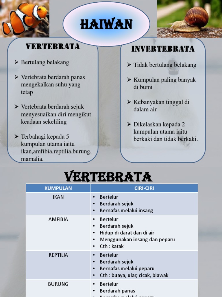 Ikan merupakan jenis hewan vertebrata terbesar di dunia. Haiwan vertebrata haiwan vertebrata adalah haiwan yang mempunyai tulang belakang. Kolom vertebral melindungi sumsum tulang belakang. Filum chordata terdiri dari empat subfilum yaitu hemichordata urochordata cephalochordata dan vertebrata.