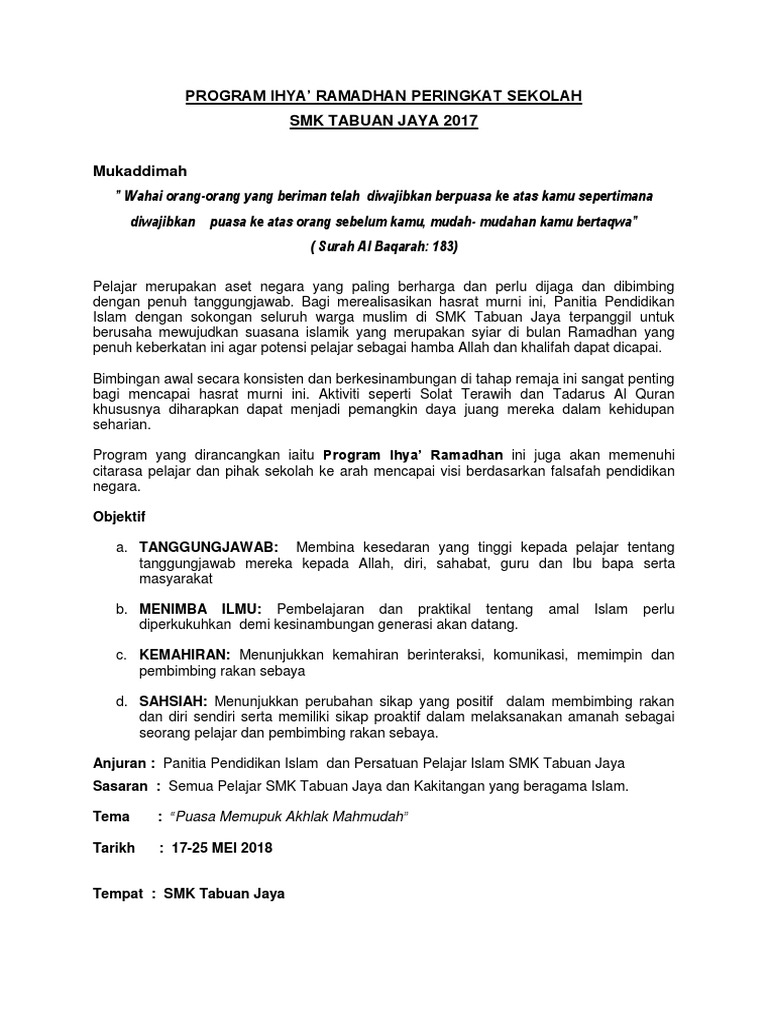 Contoh kertas kerja ihya ramadhan. Contoh rekod transit untuk semua matapelajaran. Kertas kerja program ihya ramadhan skkr 2016 program ihya ramadhan 1437h 1 0 pendahuluan ramadhan adalah bulan yang allah janjikan kepada seluruh umat untuk mendapat pahala yang berlipat ganda. V tazkirah ramadhan 5 minit setiap pagi v kutipan derma galakan bersedekah tabung ihya ramadhan v majlis berbuka puasa solat terawih v pameran sempena bulan kemerdekaan dan ramadhan v majlis perasmian penutupan program ihya ramadhan dan majlis khatam al quran 1432 h. Contoh kertas kerja program ihya ramadan sempena bulan ramadan yang bakal tiba kebiasaanya sekolah akan mengnjurkan beberapa program untuk mengimarahkan lagi bulan tersebut.