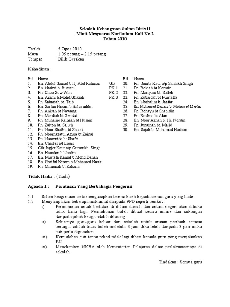 Untuk melihatkan sendiri contoh format minit mesyuarat terkini boleh semak pada pautan gambar di bawah ini contoh format terkini format tidak terlalu berbeza tidak kira anda mesyuarat anda adalah mesyuarat panatia subjek mesyuarat pibg meeting kokurikulum mesyuarat sukan mesyuarat unit bimbingan dan kaunseling ataupun untuk mesyuarat jawatankuasa kurikulum lebih kurang sama sahaja. Penghulu mengucapkan ribuan terima kasih kepada pengerusi jkkk dan kepada semua ahli jkkk kerana telah mengundang beliau dalam mesyuarat yang kedua kali ini. Minit mesyuarat pend islam pertama. Beliau memaklumkan kepada semua guru bahawa mesyuarat ini adalah penting untuk kecemerlangan akademik.