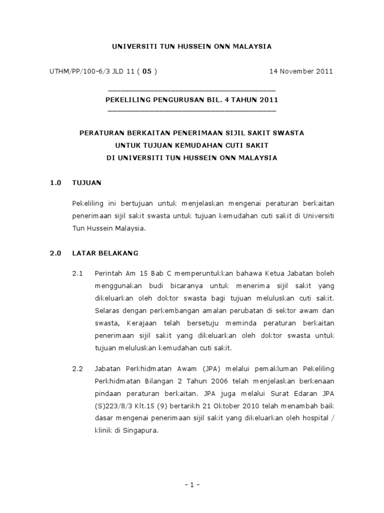 Cuti sakit swasta melebihi 15 hari. H sijil sakit dari klinik swasta tanpa sokongan pegawai perubatan kerajaan boleh diterima tidak melebihi 15 hari dalam satu tahun kalendar. Kemudahan cuti sakit boleh diluluskan dengan syarat syarat seperti berikut. Pada satu sijil sakit swasta pegawai telah diberikan rehat selama 20 hari dan tidak tinggal di wad maka sijil sakit tersebut memerlukan tandatangan pegawai perubatan kerajaan. Walaubagaimana pun cuti sakit swasta kerajaan tidak lebih 180 hari 90 hari pertama ketua jabatan 90 hari berikutnya kuasa tertentu sila rujuk pekeliling perkhidmatan 2 2006 pindaan peraturan penerimaan sijil sakit swasta untuk tujuan kemudahan cuti sakit.