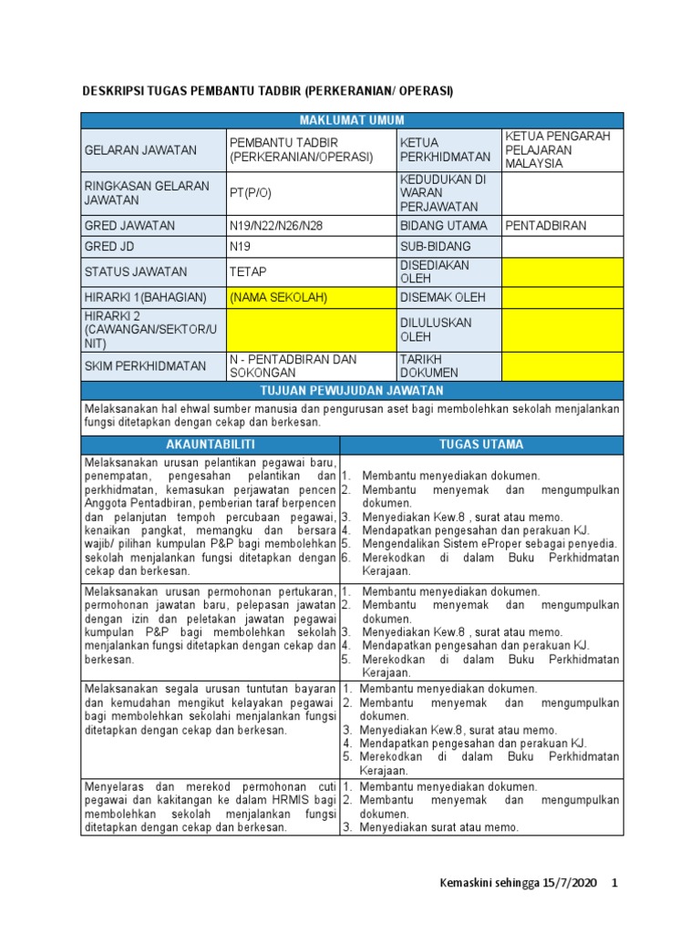 Jd pembantu operasi n14. Deskripsi tugas jd ppm asrama n19 sekolah rendah. Bahagian pembangunan organisasi jabatan perkhidmatan awam agensi permohonan pbo tpbk pertimbangan kelulusan kpp pp. Senarai tugas kpt ketua pembantu tadbir n26 menyelia membimbing dan membuat penyeliaan kerja dalam semua urusan berkaitan pentadbiran perkhidmatan kewangan sekolah serta disiplin bagi staf sokongan sekolah.