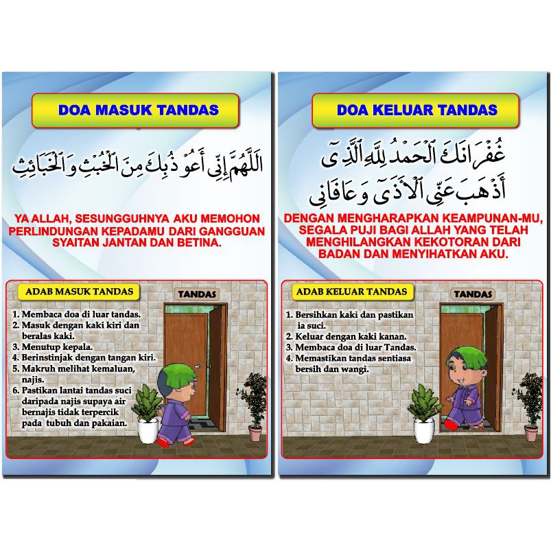 Bacaan niat wudhu dan doa setelah wudhu beserta latin dan artinya itulah lafadz atau bacaan doa masuk rumah maupun keluar dari rumah. Doa hendak masuk tandas ب س م الله الل ه م إ ن ي أ ع وذ ب ك م ن ال خ ب ث و ال خ ب ائ ث dengan nama allah ya allah aku berlindung denganmu daripada syaitan jantan dan syaitan betina. Disini disediakan doa masuk tandas dan keluar tandas serta adab adab ketika beristinjak. Keluar rumah dengan kaki kanan terlebih dahulu.