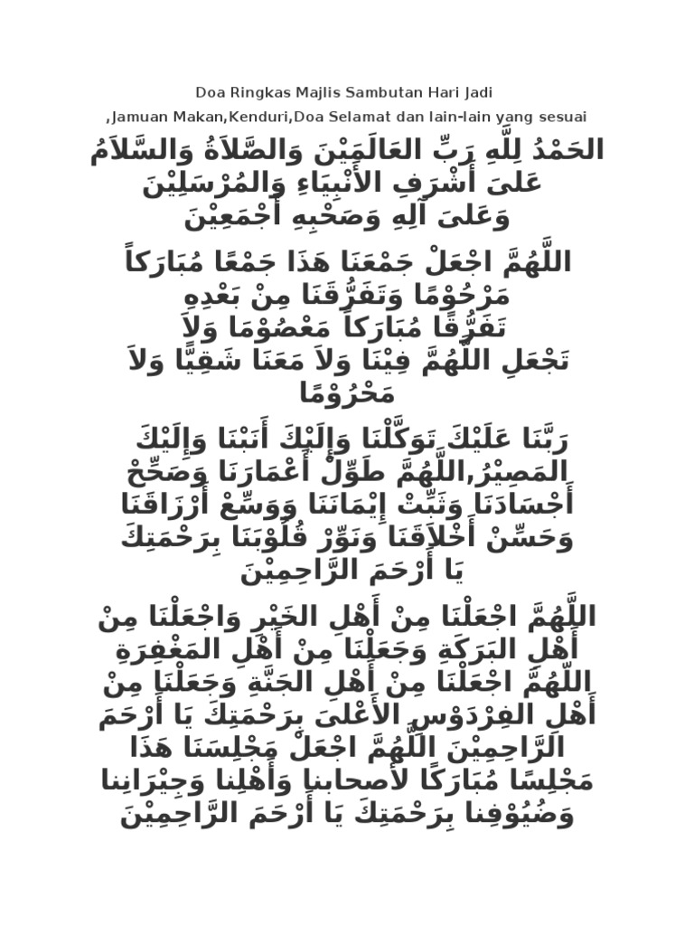 Bismillahirahmanirrahim alhamdulillahirabbil alamin hamdan yuwaafi ni mahuu wa yukaafi maziidah. Biasalah kadang kadang tiada orang yang berani memikul tanggungjawab ini walaupun nampak mudah. Doa ringkas majlis sambutan hari jadi jamuan makan kenduri doa selamat dan lain lain yang sesuai. Wahai tuhan yang maha melimpah rahmat dan keberkatannya kami pohonkan agar majlis kami ini sentiasa diiringi lembayung rahmat dan berkat dari mu agar di sepanjang majlis ini berjalan kami senantiasa mengingati mu dan mencari redha mu.