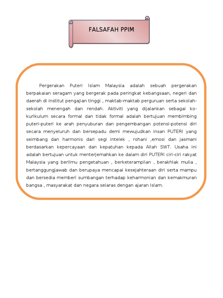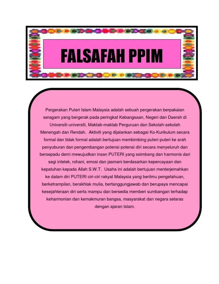 Falsafah puteri islam sekolah rendah. Dan sejarah ppim falsafah ppim pergerakan putei islam malaysia adalah. Falsafah ppim adalah sebuah. Badan unit beruniform yang bergerak diperingkat kebangsaan negeri daerah ipta institut perguruan sekolah menengah dan sekolah rendah aktiviti yang dijalankan sebagai aktiviti ko kurikulum di peringkat sekolah. Aktivitinya yang dijalankan sebagai ko kurikulum secara formal dan tidak formal adalah bertujuan membimbing puteri puteri ke arah penyuburan dan pengembangan potensi potensi diri secara menyeluruh dan bersepadu demi mewujudkan insan puteri yang.