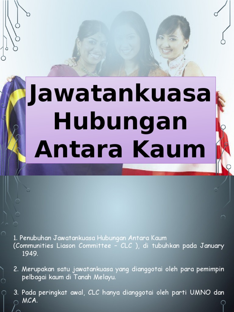 Jawatankuasa hubungan antara kaum. Objektif pembentukan clc jhak 2. A melahirkan perpaduan kaum b menanamkan semangat kesetiaan c melindungi kepentingan ekonomi d melambatkan kemerdekaan negara 3 jadual berikut merujuk kepada anggota jawatankuasa hubungan antara kaum 121 jawatan tokoh penasihat sir malcom macdonald pengerusi x x ialah a tun h s. Contoh penubuhan jawatankuasa hubungan antara kaum communities liason committee clc 1949 3. Jawatankuasahubungan antara kaum 2.