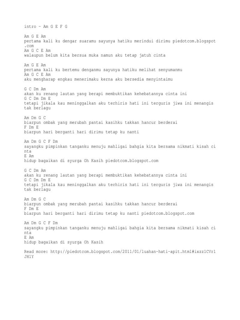 Waktu pertama kali ku lihat dirimu hadir. Waktu pertama kali ku lihat dirimu hadir rasa hati ini inginkan dirimu hati tenang mendengar suara indah menyapa geloranya hati ini tak ku sangka rasa ini tak tertahan hati ini slalu untukmu terimalah lagu ini dari orang biasa tapi cintaku padamu luar biasa aku tak punya bunga aku tak punya harta yang kupunya hanyalah hati yang setia tulus. Hati tenang mendengar suara indah menyapa. Lirik dan chord cinta luar biasa andmesh kamaleng.