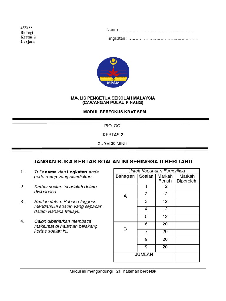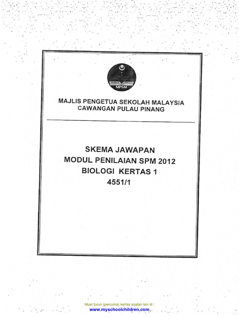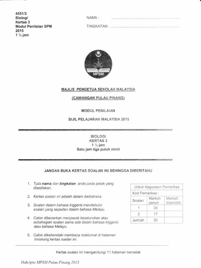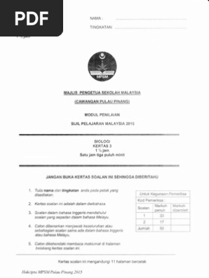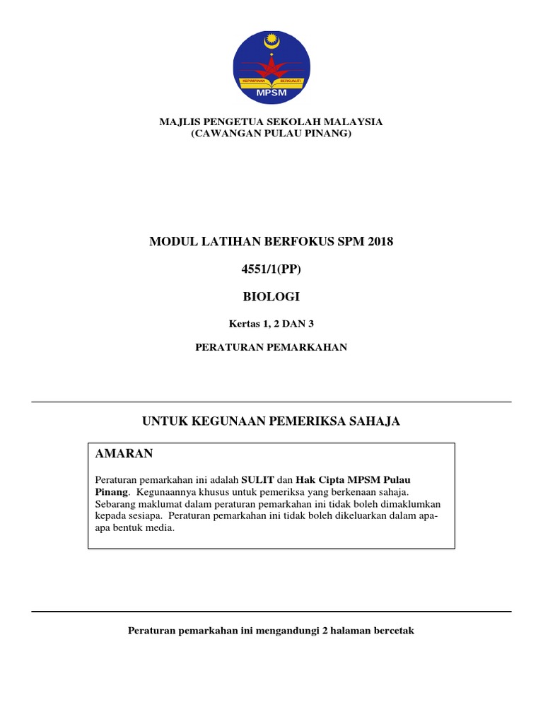 Majlis pengetua sekolah malaysia cawangan pulau pinang modul latihan berfokus spm 2018 4551 1 pp biologi kertas 1 2 dan 3 peraturan pemarkahan untuk kegunaan pemeriksa sahaja peraturan pemarkahan ini mengandungi 2 halaman bercetak amaran peraturan pemarkahan ini adalah sulit dan hak cipta mpsm pulau pinang. The file is in the google drive please note that the paper 1 2 and 3 are created by majlis pengetua sekolah menengah pulau pinang mpsm pulau pinang. Wednesday october 13 2010.