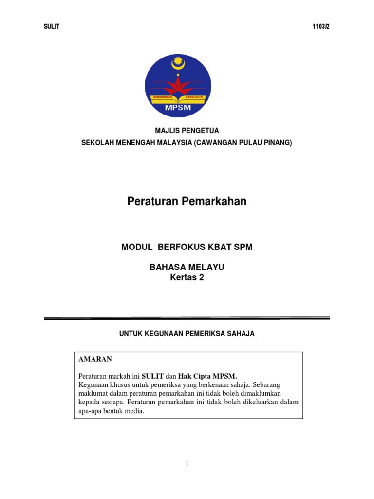 Majlis pengetua pengetua sekolah malaysia cawangan pulau pinang modul latihan berfokus spm 2018 bahasa melayu kertas 1 1103 1 bahasa melayu kertas 1 peraturan pemarkahan untuk kegunaan pemeriksa sahaja bahasa melayu kertas 1 1103 1 bahagian a.