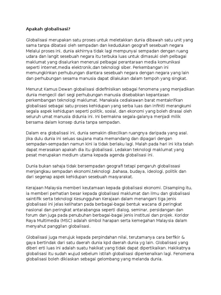 Globalisasi adalah proses mendunianya suatu hal sehingga batas antara negara menjadi hilang. Fenomena yang menjadikan dunia kelihatan kecil dari segi. Dewan bahasa dan pustaka tidak akan bertanggungjawab bagi sebarang kehilangan dan kerugian yang disebabkan oleh penggunaan maklumat. Hak cipta terpelihara 2013 dewan bahasa dan pustaka malaysia.
