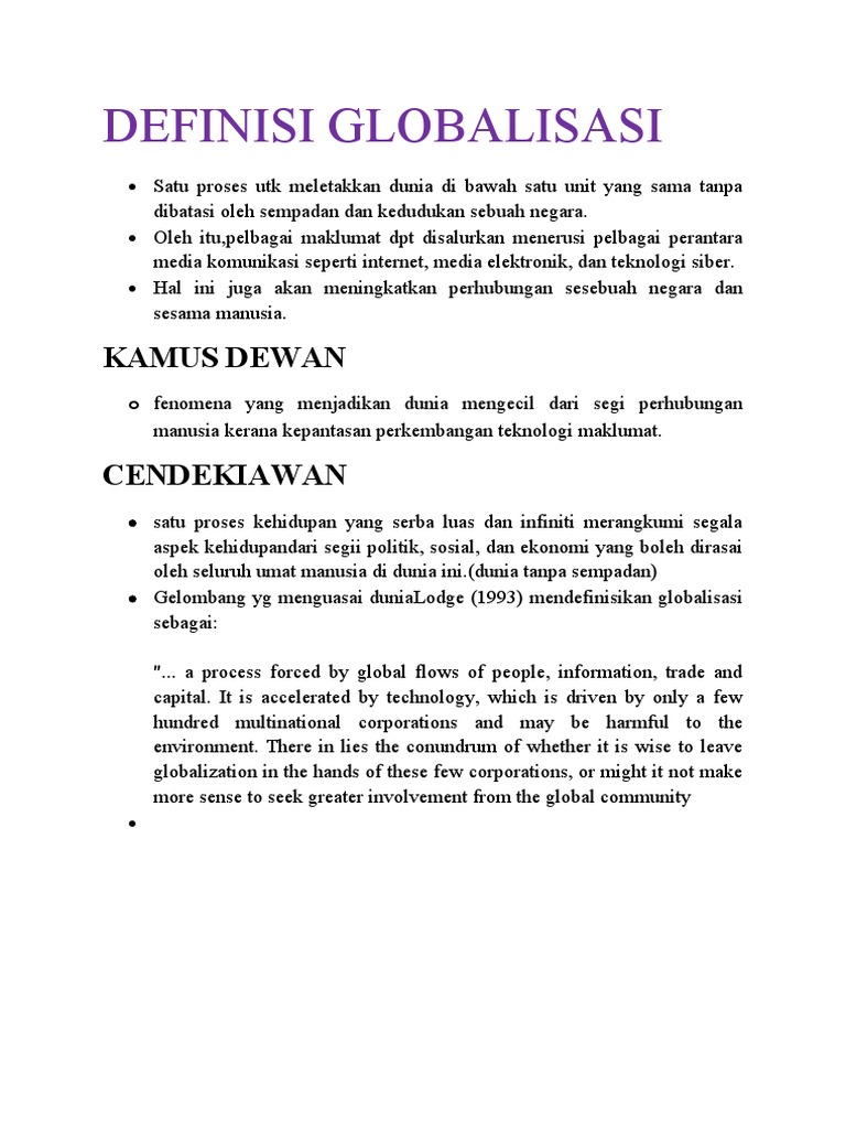 Menurut kamus dewan globalisasi didefinisikan sebagai fenomena yang menjadikan dunia mengecil dari segi perhubungan manusia disebabkan kepantasan show more content globalisasi juga merujuk kepada perpindahan nilai terutamanya cara berfikir gaya bertindak dari satu daerah dunia kepada daerah dunia yang lain. Bab 15 globalisasi definisi kamus dewan fenomena yang menjadikan dunia kelihatan mengecil dari segi perhubungan manusia disebabkan kepantasan teknologi maklumat muhammad uthman al muhamady. Globalisasi globalisasi glo ba li sa si ujygls definisi. 548 dari segi bahasa globalisasi berasal dari kata dasar global yang bererti umum keseluruhan sejagat atau menyeluruh.