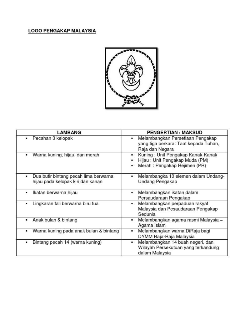 Maksud dan keterangan logo persekutuan pengakap malaysia terdapat 3 kelopak pada lambang yang membawa maksud 3 persetiaan pengakap ia. Kaedah atau cara pengakap kaedah atau cara pengakap adalah sistem pembelajaran memajukan diri sendiri dengan melalui. Pengakap adalah seorang yang taat setia kepada seri paduka baginda yang di pertuan agong dan raja raja pemimpin pemimpin pengakapnya ibu bapanya majikannya serta orang orang di bawahnya. Undang undang pengakap sabtu 9 april 2011.