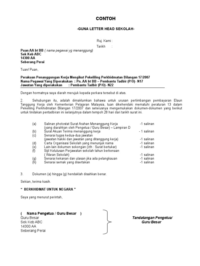 Portal rasmi jabatan perkhidmatan awam jpa. Latar belakang peraturan penanggungan kerja perkhidmatan awarn telah dikuatkuasakan melalui pekeliling perkhidmatan bilangan 17 tahun 2007 pp 17 2007 dan surat edaran bil. Sekiranya ada keperluan ketua jabatan hendaklah membuat permohonan semula supaya pegawai diluluskan untuk terus menanggung kerja kepada pihak berkuasa melulus. Arahan penanggungan kerja seseorang pegawai hendaklah dibuat secara bertulis oleh ketua jabatan.