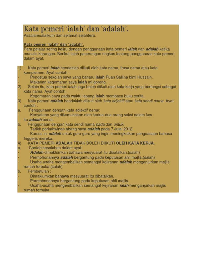 Contoh contoh yang dapat dilihat daripada penggunaan kedua dua kata pemeri ini adalah seperti berikut. Kata pemeri adalah digunakan di hadapan frasa sendi nama dan frasa adjektif. Penggunaan kata adalah ialah dan yakni yaitu sering dipertukarkan agar kalimat yang kamusampaikan itu efektif dan komunikatif perhatikan penggunaan kata adalah ialah dan yaitu yakni berikut ini. Kata pemeri ialah dan adalah tidak boleh digunakan bersama kata nafi kecuali dalam bentuk adalah kata nafi tidak frasa adjektif penggunaan kata pemeri amat terhad dan kurang digalakkan dalam pembentukan ayat.