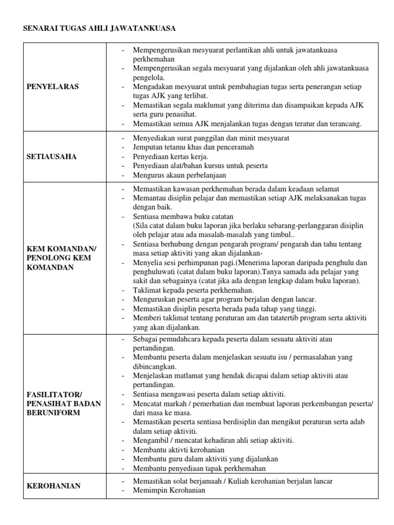 Senarai Bidang Tugas Ahli Jawatankuasa