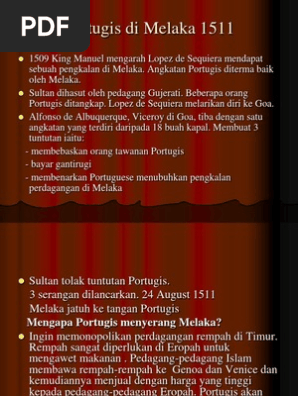 Sejarah kedatangan portugis ke melaka faktor kedatangan portugis faktor kedatangan portugis ke melaka gold kekayaan gospel glory kemegahan keagamaan gold kekayaan menguasai selat melaka keuntungan lumayan menguasai perdagangan rempah yang dikuasai oleh pedagang. Masih melancarkan serangan terhadap portugis di melaka. Da gama bermaksud untuk menumui raja. Menurut catatan portugis pada tahun tersebut serangan demi serangan yang dilakukan dapat dipatahkan.