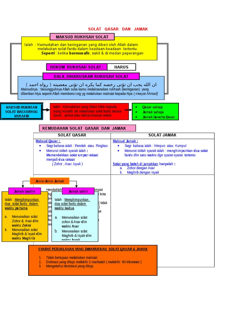 Solat qasar dan jamak. Hukum dan syaratnya sama dengan salat jamak dan salat qasar. Salat jamak qasar dapat dilaksanakan secara takdim maupun ta khir. Pengertian shalat jamak qasar shalat jamak qasar adalah menggabungkan dua shalat fardu dalam satu waktu sekaligus meringkas qasar. Jika orang yang bermusafir berniat untuk berada di situ selama 3 hari namun urusan tidak dapat diselesaikan dalam tempoh tersebut maka diharuskan jamak dan qasar sehingga 18 hari.