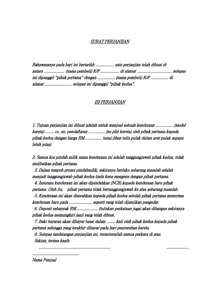 Surat jual beli kereta terpakai. Perjanjian jualbeli 1 perjanjian penyerahan kenderaan perjanjian ini dibuat pada 28 10 2013 bersamaan pada hari isnin di pejabat tetuan azrulhisham co yang beralamat lot 1342 tingkat satu hadapan hospital besut jalan pasir akar 22000 jerteh terengganu. Surat ini merupakan perjanjian bila kita membeli kenderaan sama ada kereta motosikal dan lain lain. Bagi anda yang menggunakan kereta untuk bergerak ke sana dan ke mari pasti perlukan sebuah kereta yang mampu dibayar dan dimiliki. Perkongian yg berguna moga dapat pahala.