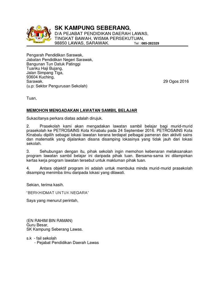 Bagi menjalankan sesebuah kajian di sekolah kebenaran pihak jabatan pendidikan negeri amat penting bagi memastikan kajian tersebut adalah benar dan mengikut prosedur. Contoh surat rasmi kepada pengarah surat kepada sektor swasta badan bukan kerajaan atau pertubuhan hendaklah dialamatkan kepada ketua organisasi berkenaan mengikut gelaran rasmi jawatannya diikuti dengan nama alamat rasmi serta nama pegawai yang hendak dihubungi. Paparan terbaik menggunakan mozilla firefox google chrome internet explorer 9 0 ke atas dengan resolusi 1024 768. 2 3 tarikh tarikh surat dicatat satu enter di bawah rujukan kami dan rujukan tuan.