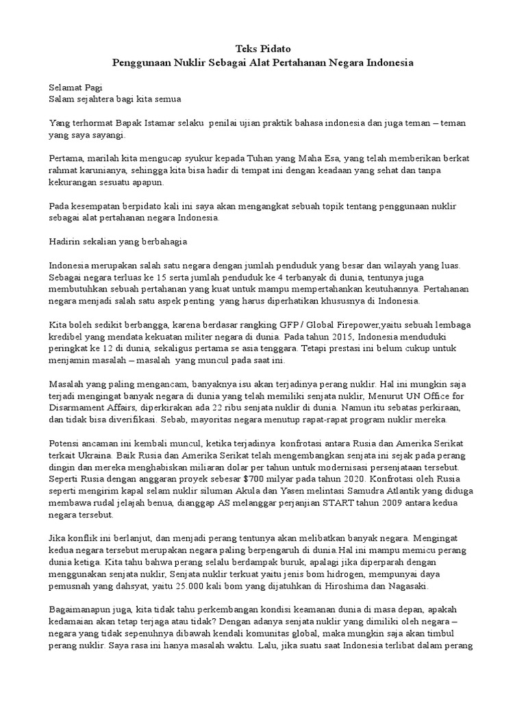 Teks pidato isu semasa pendek. Seterusnya hakikat tidak pernah berdusta apabila mengangkat rasulullah sebagai rollmodel dan contoh tauladan kerana semasa zaman remaja baginda keunikan dalam gerak kerja dan tindakan. Rakyat berintegriti negara cemerlang teks pidato kemanan dunia bukan impian. Yang mulia tuan pengerusi majlis barisan panel hakim yang arif dan berpaksikan keadilan saudara penjaga masa yang setia dengan randiknya para guru rakan rakan serta hadirin hadirat yang saya hormati sekalian. Ya pidato merupakan suatu ucapan dengan susunan yang baik dan sopan untuk menyempaikan sesuatu hal kepada khalayak.