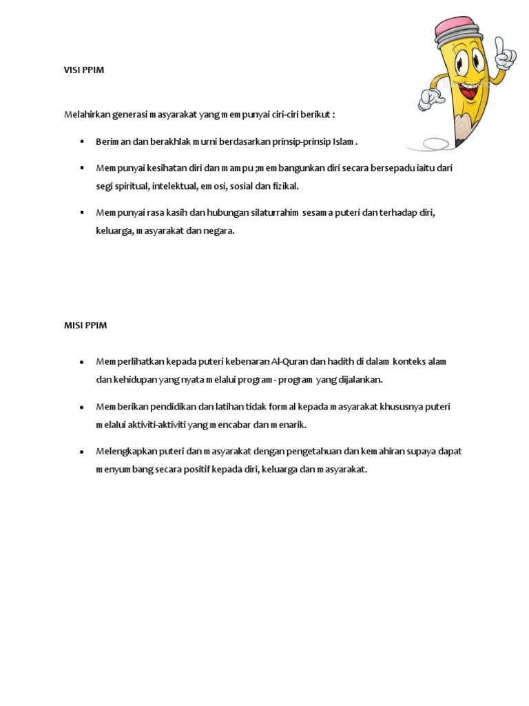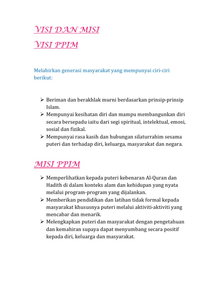 Visi dan misi ppim. Memberikan pendidikan dan latihan tidak formal kepada masyarakat khususnya puteri melalui aktiviti aktiviti yang mencabar dan menarik. Visi menjadi tunggak utama dalam perjuangan hak dan pembangunan pengguna islam. Beriman dan berakhlak murni berdasarkan prinsip prinsip islam. Mempunyai kesihatan diri dan mampu membangunkan diri secara bersepadu iaitu dari segi spiritual intelektual emosi sosial dan fizikal.
